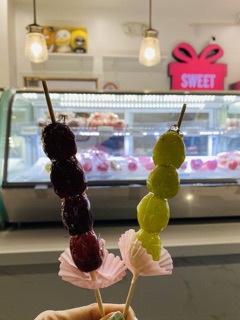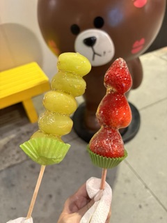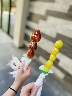 The grape tanghulu was very good. The strawberry one was kinda difficult to bite into bc of how plump it was but still taste fine. The outer coating started to melt so the sugar was slowly dripping down when we walked around